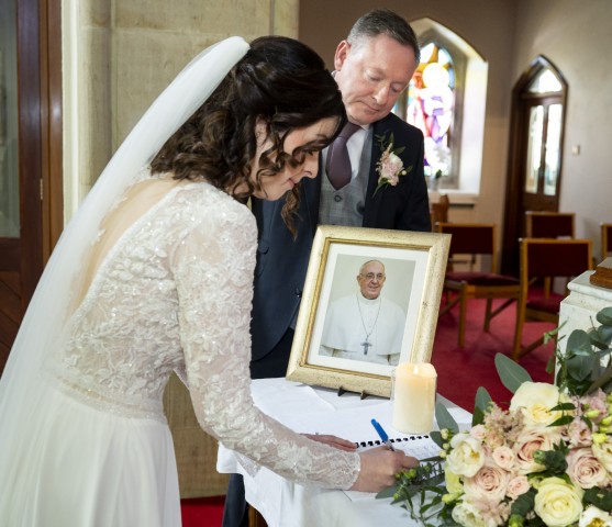 Alan McCloskey and Edel Gargan are pictured on Saturday after saying a prayer in The Lady Chapel of the Church of the Immaculate Conception, Kingscourt on the day of their wedding and signing the Parish Book of Condolence for Pope Francis whose funeral had taken place earlier in Rome. Endings and new beginnings.