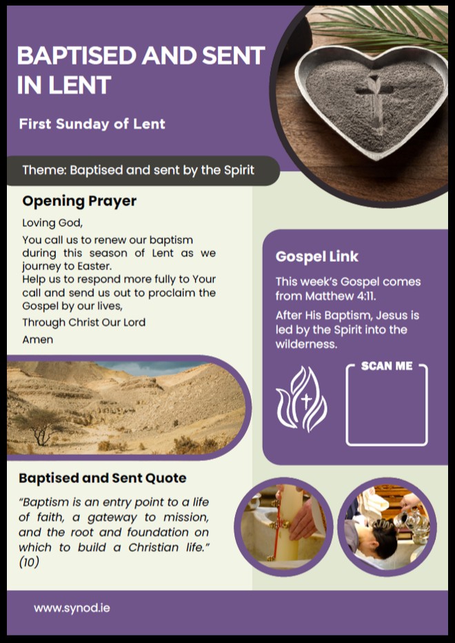 The Irish Synodal Pathway Team is pleased to share Baptised and Sent in Lent, a new set of weekly prayer and reflection resources for the Lenten season ahead. The Feast of the Baptism of Our Lord reminds us that baptism is the foundation of our identity and mission as Christians. It is from our baptism that we are sent to live the Gospel in our daily lives. In that spirit, these resources are offered now to give parishes, schools, and faith groups time to prepare and plan together before Lent begins.